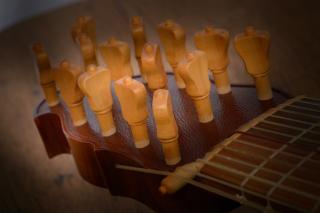 We'll be working at [408 Hz] and mostly at 458 Hz since we have matched sets of recorders, flutes, cornettos, viols and a harpsichord at these pitches, exactely a whole step apart for easy transpositions. For the wind players we provide these consort instruments. We do have a nice consort of Henry Jaye viol copies (to late and wrong country for this year - we know) for players from abroad who don't want to fly with their instruments. If you have Renaissance viols - that would be great. The lute players should adapt to the high pitch of 458 Hz this year either by re-stinging their lutes if the scale is short enough or by tuning to 408 Hz and setting a capo to the second fret. Dieter Schossig can make these capos. Please measure the width of our lute neck at the second fret and place an order not later than 8 weeks before you need it.